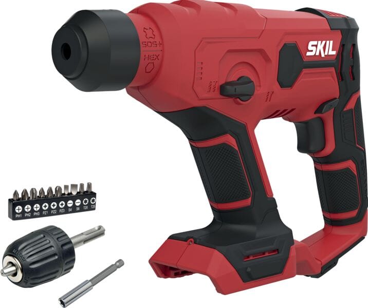 Leveres med et bitssett med 10 skrutrekkerbits, en 75 mm magnetisk bitsholder og en chuck uten nøkkel med SDS+-adapter. Batteriet er ikke inkludert.
